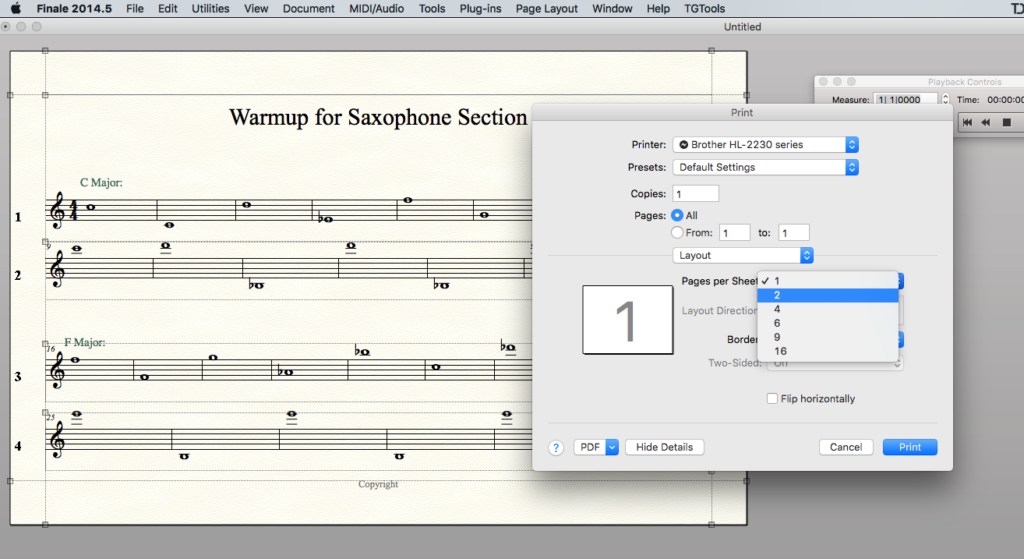 Windows Users: “Click Setup to open your printer’s settings (you may also need to click a Properties button). Set the Pages per sheet option to 2 pages with a portrait orientation. (Do not use the “2-up” option in the Print dialog box.)” – this info is available in the Finale Printing Guide.